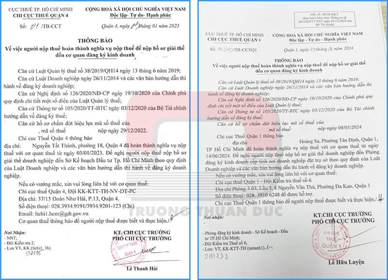 Trường Thuận Đức làm việc với cơ quan thuế để hoàn tất thủ tục quyết toán. Hủy hóa đơn giá trị gia tăng (VAT) nếu còn tồn tại. Nhận giấy xác nhận không còn nợ thuế để tiến hành các bước tiếp theo.